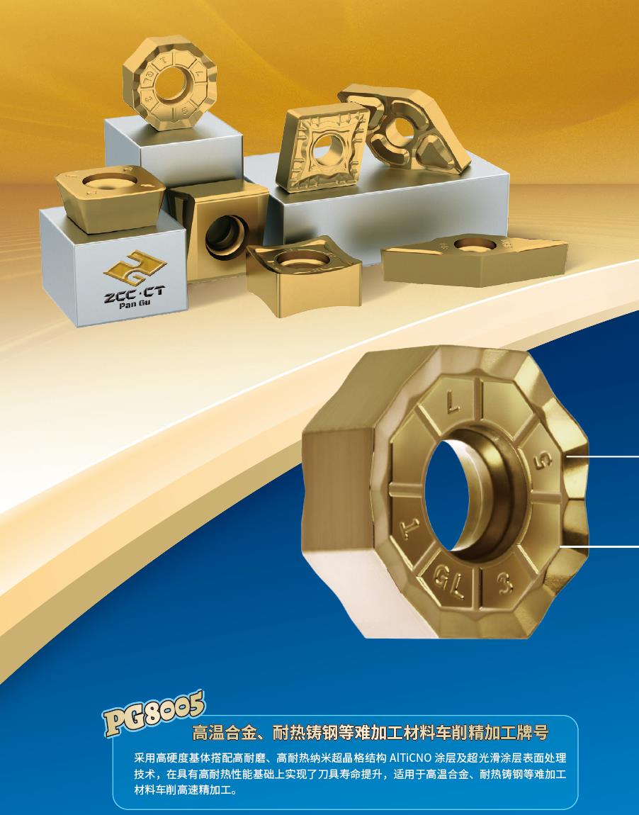 適合難加工材料高效加工的PG8系列數(shù)控刀片牌號(hào):PG8系列牌號(hào)采用高硬度基體搭配高耐磨、高耐熱納米超晶格結(jié)構(gòu)涂層以及超光滑涂層表面處理技術(shù),適用于高溫合金、耐熱鑄鋼等難加工材料。PG8005搭配NGFSNR車削槽型分別用于難加工材料的高效車削精加工。PG80208030搭配FMA12、EMP09FMP17等銑削刀具用于難加工材料的面銑、方肩銑以及仿型銑等加工。
