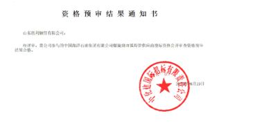 ? 2023年6月19日,山東勝利鋼管有限公司收到中化建國(guó)際招標(biāo)責(zé)任有限公司書(shū)面通知: “山東勝利鋼管有限公司:經(jīng)評(píng)審,貴公司參與的中國(guó)海洋石油集團(tuán)有限公司螺旋縫埋弧焊管供應(yīng)商投標(biāo)資格公開(kāi)審查資格預(yù)審結(jié)果合格。” 這表明,山東勝利成功入圍中國(guó)海洋石油集團(tuán)有限公司的優(yōu)選供應(yīng)商,近三年內(nèi),公司將具備參與中海油螺旋縫埋弧焊管的投標(biāo)資格。2023年3月24日,中國(guó)海洋石油集團(tuán)有限公司發(fā)出招標(biāo)公告,就中國(guó)海洋石油集團(tuán)有限公司螺旋縫埋弧焊管供應(yīng)商投標(biāo)資格公開(kāi)審查進(jìn)行國(guó)內(nèi)公開(kāi)招標(biāo)。我公司積極報(bào)名參與投標(biāo),經(jīng)過(guò)精心準(zhǔn)備,于2023年4月7日遞交了資格預(yù)審文件。本次資格審查采用有限數(shù)量制,評(píng)審方法使用綜合評(píng)審法。審查委員會(huì)按資格預(yù)審文件所附評(píng)分標(biāo)準(zhǔn)進(jìn)行打分,在總得分高于75分的申請(qǐng)人中,按照得分排名由高到低的順序選擇前9家(不足9家時(shí)全部選?。?,形成候選申請(qǐng)人名單,進(jìn)行現(xiàn)場(chǎng)考察。 資格預(yù)審文件評(píng)審結(jié)果我公司排名靠前,順利進(jìn)入到現(xiàn)場(chǎng)考察階段。2023年5月19日,中國(guó)海洋石油集團(tuán)有限公司考察團(tuán)對(duì)我公司進(jìn)行了現(xiàn)場(chǎng)考察。 現(xiàn)場(chǎng)考察采用否決制,對(duì)資格預(yù)審申請(qǐng)文件內(nèi)容的真實(shí)性進(jìn)行逐項(xiàng)審核??疾靾F(tuán)重點(diǎn)考察了設(shè)備情況、提供證明文件的真實(shí)性及大管線生產(chǎn)記錄。公司各部門(mén)精誠(chéng)合作,積極配合現(xiàn)場(chǎng)考察工作,現(xiàn)場(chǎng)考察順利通過(guò),沒(méi)有任何問(wèn)題,考察團(tuán)對(duì)我公司高度認(rèn)可。我公司成功通過(guò)中國(guó)海洋石油集團(tuán)有限公司供應(yīng)商的書(shū)面評(píng)審及現(xiàn)場(chǎng)考察,為成功進(jìn)入中國(guó)海洋石油集團(tuán)有限公司的優(yōu)選供應(yīng)商奠定了堅(jiān)實(shí)的基礎(chǔ)。